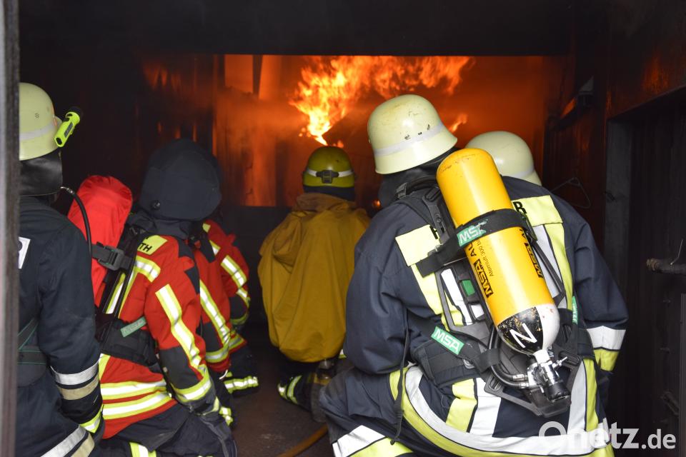 Der Trainer erklärte situationsgemäß die Phasen des Brandverlaufs und erläuterte die Gefahren, die es gilt, im Ernstfall zu erkennen und im Einsatzverlauf die richtige Reaktion erfordern. Hitzetemperaturen von bis zu 900 Grad Celsius in Feuernähe und rund 250 Grad Celsius auf Köpfhöhe der im Container knienden Atemschutzträger im "Observationsraum" entstanden dabei.