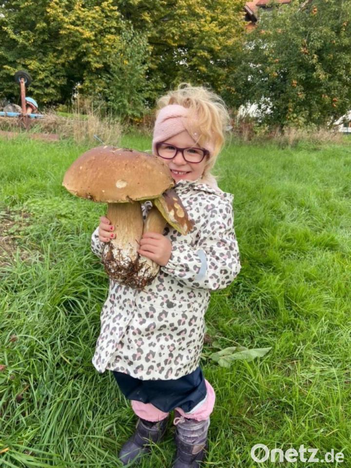 Elisa aus Waldershof war das erste Mal beim Schwammern und hatte gleich den richtigen Riecher und großes Glück: Die Vierjährige hat im Garten einen riesigen Steinpilz gefunden. Das Prachtexemplar ist 29 Zentimeter breit, 29 Zentimeter hoch und 1390 Gramm schwer