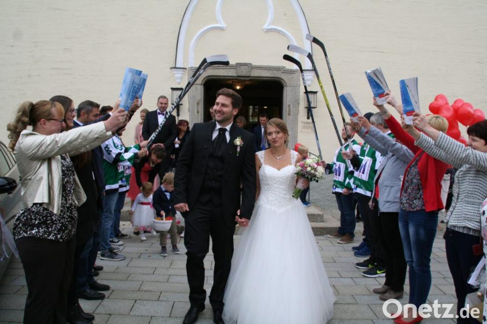 Den Gottesdienst am Samstag zelebrierte Pfarrer Robert Ploß. Für die musikalische Umrahmung sorgte der Waldershofer Kirchenchor "Carpe Diem". Nach der Trauung standen Arbeitskollegen, Freunde und die Eishockey-Spieler aus Mitterteich Spalier.