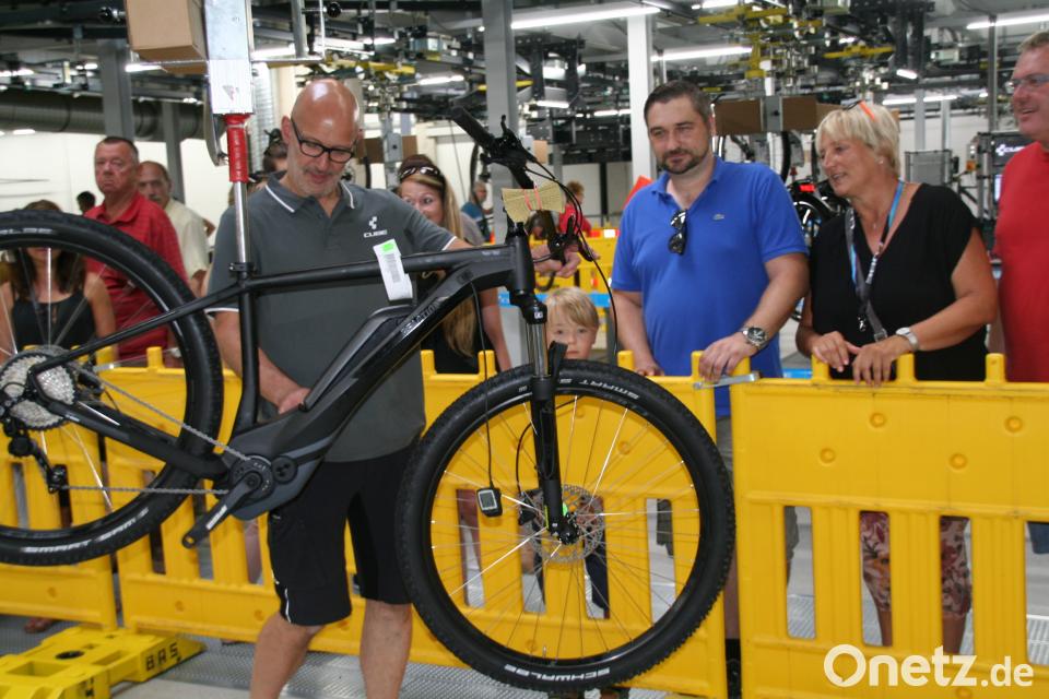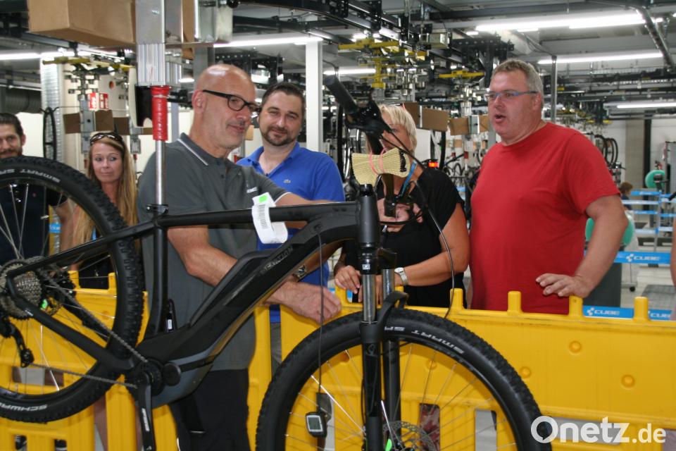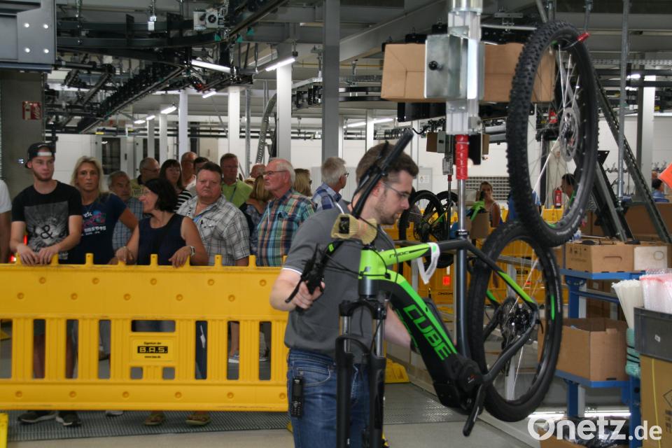 Bereits vor 10 Uhr warten schon zahlreiche Besucher beim 36 000 Quadratmeter großen Logistikzentrum. Mitarbeiter des Unternehmens weisen auf die Einhaltung der gut beschilderten Wege hin, um im Vorfeld schon Unfälle auszuschließen. Beim Rundgang durch die Lagerhallen und die Fertigung kommen viele Gäste aus dem Staunen nicht mehr heraus. Im Logistikzentrum werden jährlich 35 Millionen Teile verbaut. Am Ende des Geschäftsjahres haben mehr als 600 000 Bikes die Produktionsstätte in der Kösseinestadt verlassen. Die Cube-Produkte werden über 2515 Händler in 67 Ländern vertrieben.