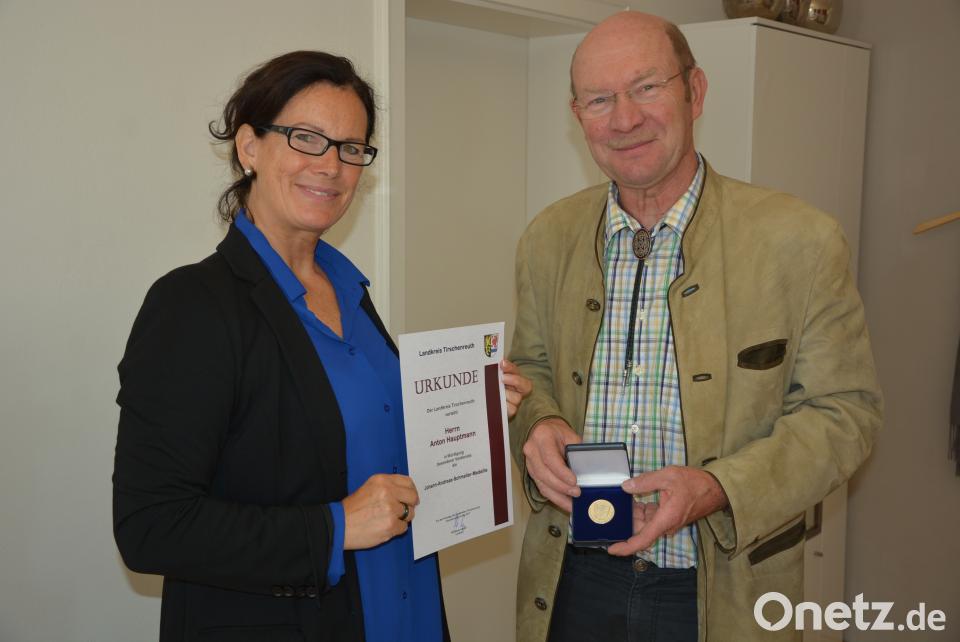 (jr) Eigentlich sollte ihm die Johann-Andreas-Schmeller-Medaille des Landkreises Tirschenreuth schon zwei Mal verliehen werden, doch beide Male war Anton Hauptmann verhindert - im vergangenen Jahr aus gesundheitlichen Gründen und heuer urlaubsbedingt. Nun holte Bürgermeisterin Friederike Sonnemann im Auftrag von Landrat Wolfgang Lippert die Auszeichnung nach und überreichte dem 60-Jährigen aus Hohenhard die Medaille im Rathaus.