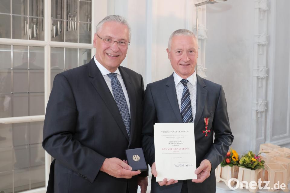 (fpoz) Engagement – ob in der Forschung oder im Ehrenamt: Das trifft auf Professor Dr. Hans Drexler, Direktor des Instituts und der Poliklinik für Arbeits-, Sozial- und Umweltmedizin der Friedrich-Alexander-Universität Erlangen-Nürnberg, zu. Für seinen Einsatz in der Arbeitsmedizin und für die Förderung des öffentlichen Gesundheitswesens ist der gebürtige Waldershofer jetzt mit dem Verdienstkreuz am Bande vom Bundespräsidenten gewürdigt worden. Bayerns Innenminister Joachim Hermann überreichte das Verdienstkreuz bei einer Feierstunde.
