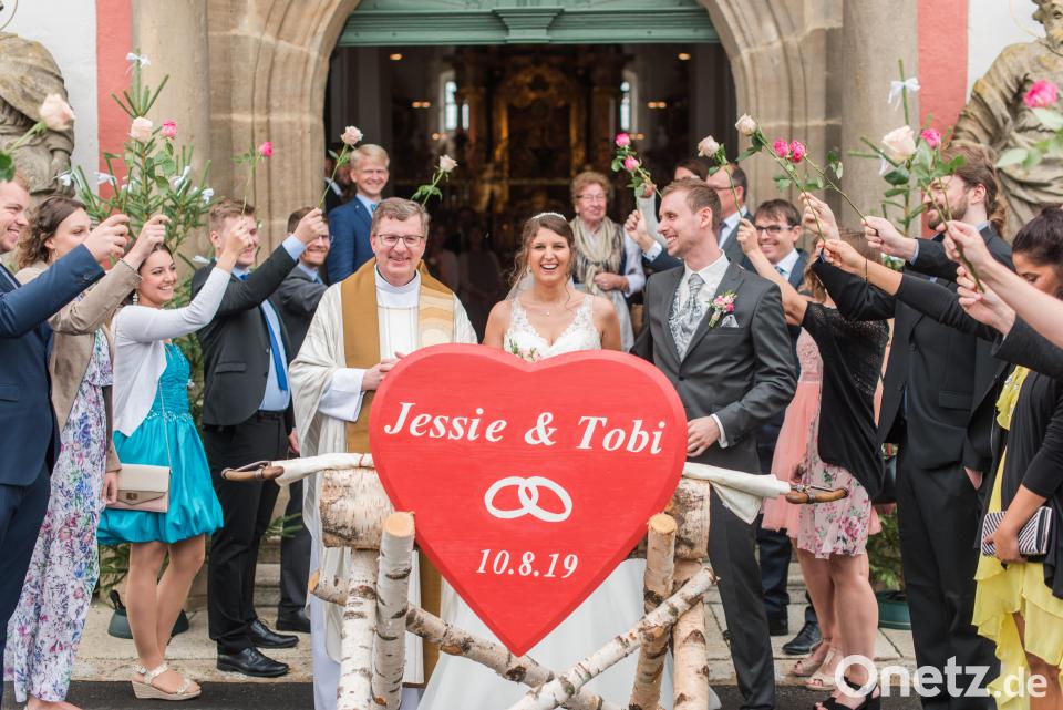 Den Gottesdienst zelebrierte Stadtpfarrer Bernd Philipp, die musikalische Umrahmung gestaltete die Sängerin Doro Beyler aus Lauf an der Pegnitz und Peter Gärtner an der Orgel. Nach der Trauung durfte das Paar das von Freunden gestaltete Rosenspalier durchschreiten und musst nach alter Tradition einen dicken Baumstamm durchsägen, was dank eines scharfen Werkzeuges gut gelang.