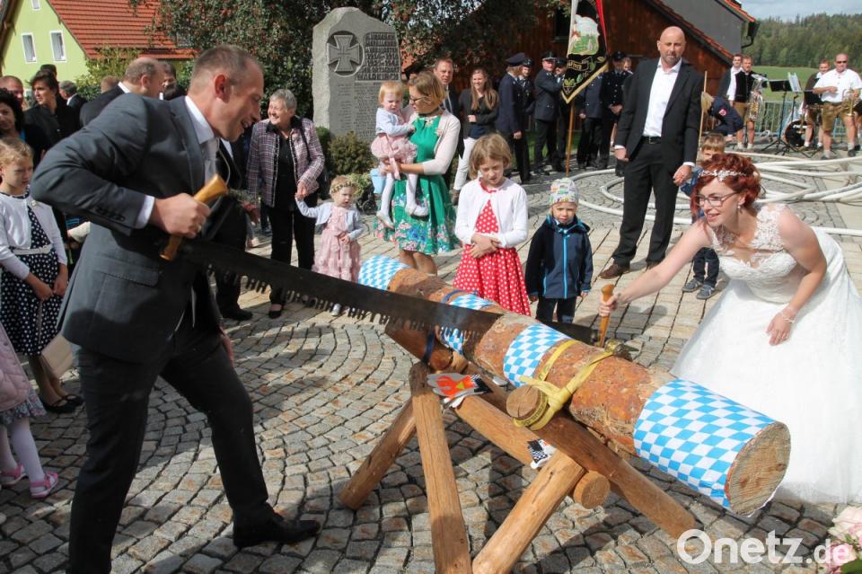 „So geht das“, gab er bei den Bayerischen Staatsforsten als Ausbilder tätige Anton dann seiner Michaela die Anweisung, wie sie mit der Säge umgehen muss. Der Tipp saß, und mühelos bewältigten die beiden das Durchsägen des von den Kollegen des Forstbetriebs Flossenbürg bereitgestellten Holzstamms. Schließlich gaben sie bei einer Egerländer Polka, gespielt von der Waldkirchner Blaskapelle, noch den Takt an und feierten ihren großen Tag dann im Landhotel „Kastanienhof“.