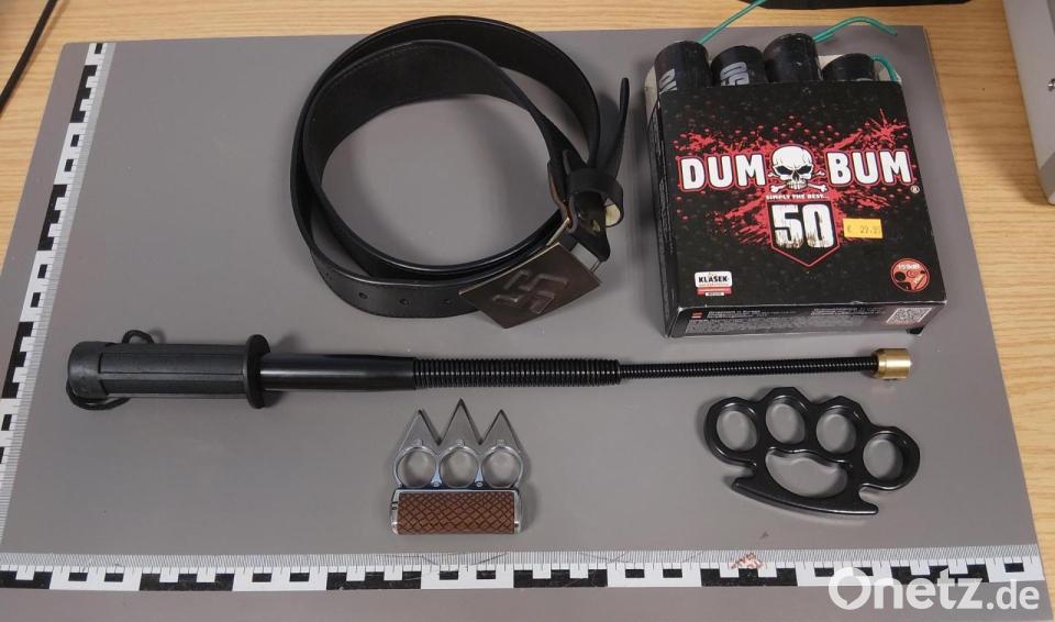 Bei einer Grenzkontrolle in Waldsassen hat die Bundespolizei am 7. Oktober verbotene Waffen, illegale Pyrotechnik und verfassungsfeindliche Symbole entdeckt und sichergestellt. Ein 19-Jähriger führte unter anderem zwei Schlagringe, einen Totschläger und Pyrotechnik der Kategorie F4 mit sich. Diese darf nur mit sprengstoffrechtlicher Erlaubnis besessen werden, die der junge Mann nicht vorweisen konnte, teilt die Bundespolizei mit. Zudem trug der 19-Jährige einen Gürtel mit einer Hakenkreuzschnalle.