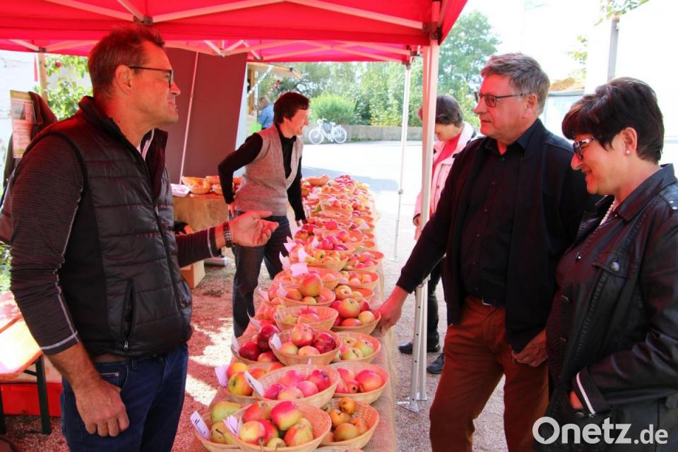 Sehr gefragt war auch der Stand des Pomologen Michael Altmann aus Schwarzenbach. Immer wieder kamen Interessierte zu ihm mit einem oder mehreren Äpfeln, um die Sorte bestimmen zu lassen. Altmann schnitt dazu den einen oder anderen Apfel auch auf, um zu kosten. Dabei kam auch der Humor nicht zu kurz.