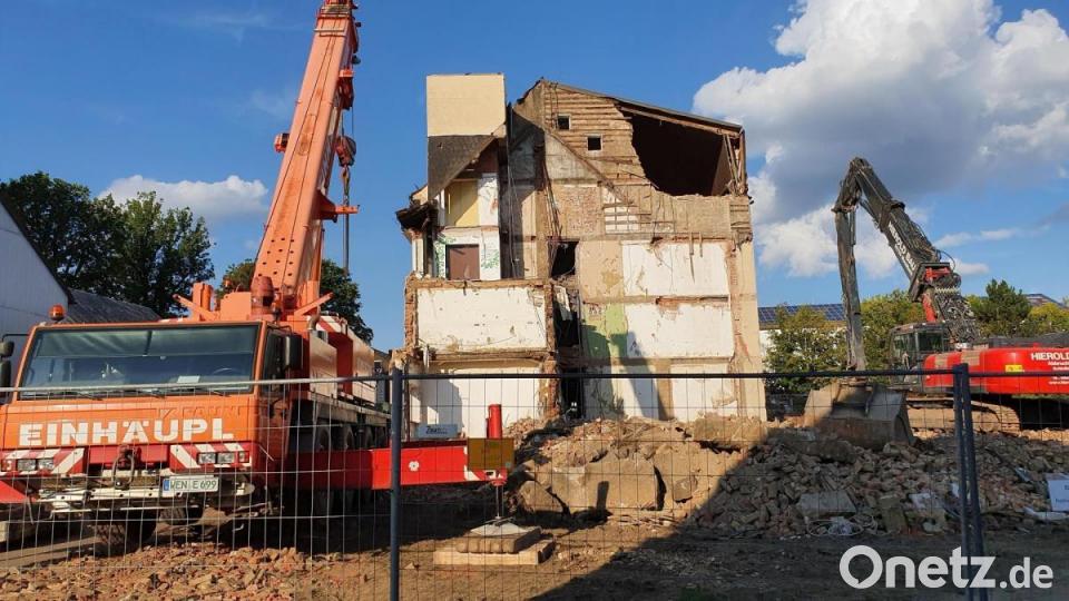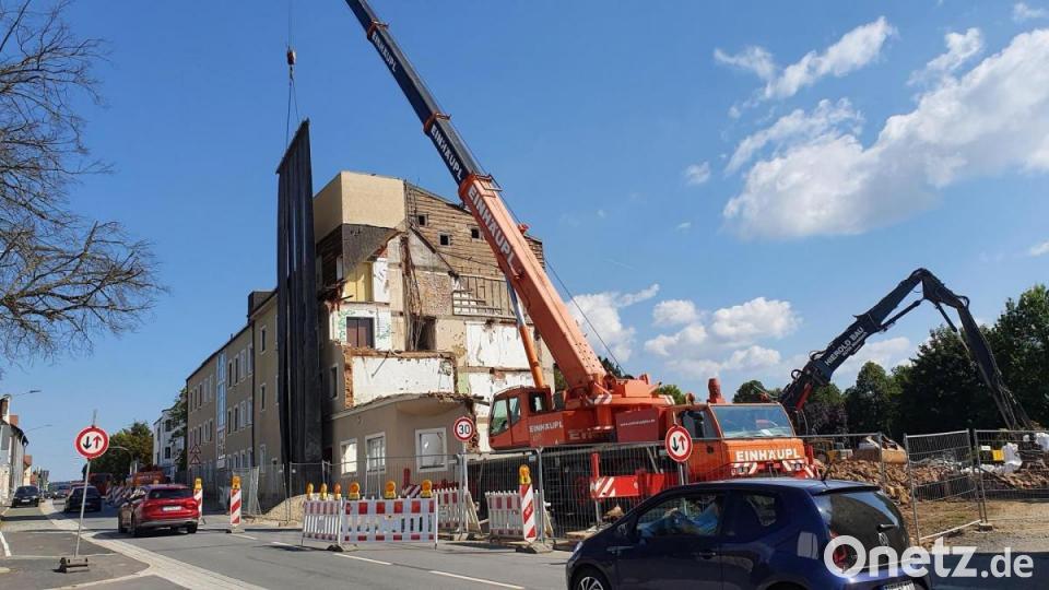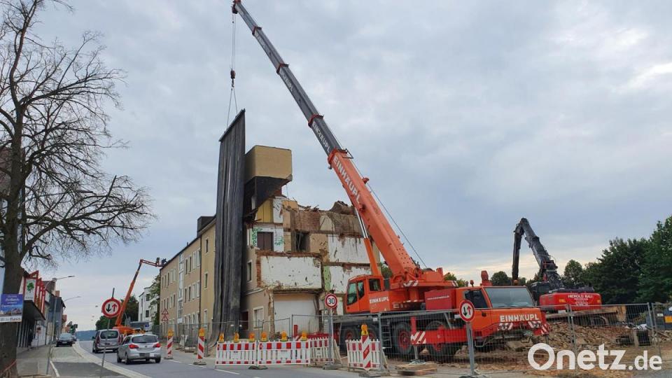 Unaufhaltsam gehen die Abbrucharbeiten beim ehemaligen Seniorenheim St. Maria in Waldsassen voran. Um Staub und herabfallende Teile von der Egerer Straße fern zu halten, werden mit einem Autokran überdimensionale Vorhänge in Stellung gebracht, währenddessen der Abbruchbagger ganze Arbeit leistet.