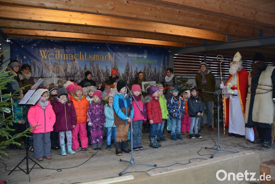 "Unsere Weihnachtsbuden laden zu einem gemütlichen Bummel ein. Kommen Sie etwas herunter vom hektischen Alltag und genießen Sie das Ambiente", betonte Bürgermeister Bernd Sommer zum Auftakt am Samstagnachmittag. Neben Sommer waren die Mädchen und Buben des Katholischen Kinderhauses St. Michael auf die Bühne gekommen. Mit Liedern und Gedichten umrahmten sie selbstbewusst und unerschrocken die Eröffnungsfeier. Die Belohnung vom Nikolaus im Anschluss hatten sie sich wahrlich verdient.