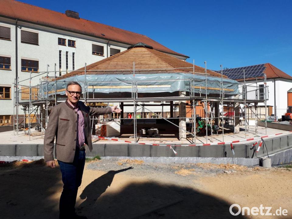 Die Erdarbeiten und die Betonarbeiten sind erledigt, jetzt geht es an die Holzbauarbeiten: Alles nach Plan läuft bei der Erweiterung der Aula der Markgraf-Diepold-Grundschule in Waldsassen.