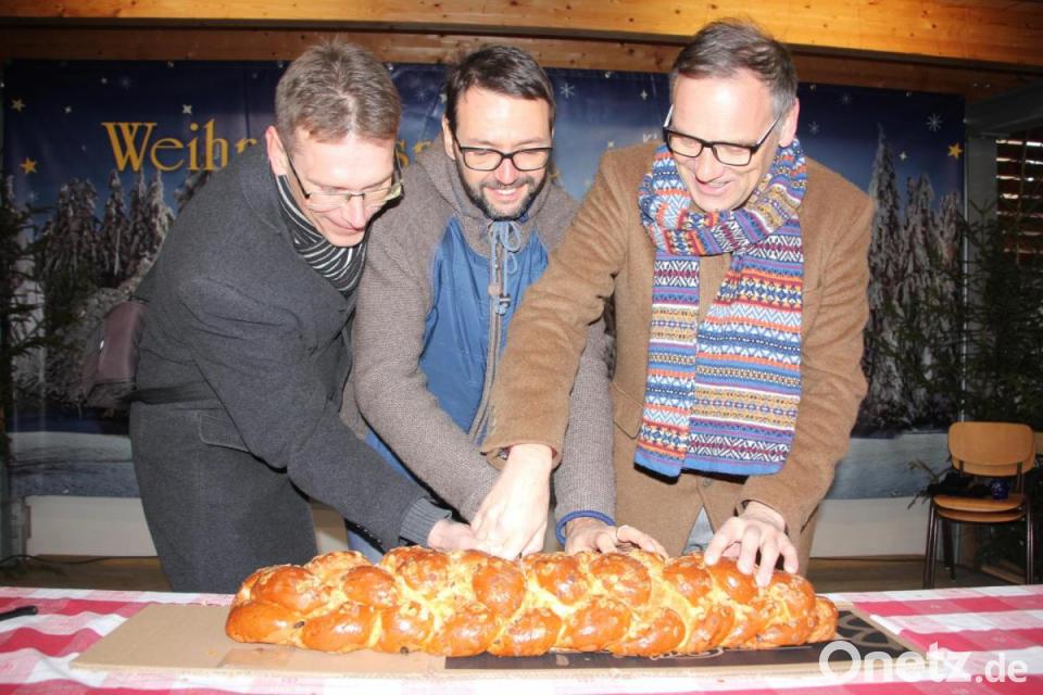 Die Städtepartnerschaft zwischen Waldsassen und Chodov wird von beiden Seiten voll gelebt. Am Sonntag reisten die Tschechen mit einem 50-Mann-Bus zum Waldsassener Weihnachtsmarkt. Mit dabei waren Bürgermeister Patrik Pizinger und sein Stellvertreter Ludek Sonkup. Einer der Höhepunkte war das gemeinsame Anschneiden eines echten böhmischen Weihnachtsstollen aus Chodov, der etwa einen Meter lang war.