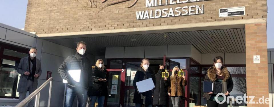 An der Mittelschule in Waldsassen erhielten jetzt die Lehrkräfte 16 Endgeräte für den Einsatz im Distanzunterricht. Die Schulleitung mit Claudia Strobel-Dietrich und Petra Burger hatte zu einem offiziellen Übergabetermin eingeladen. Bei dem Termin mit dabei waren Bürgermeister Bernd Sommer – als Vertreter des Schulaufwandsträgers – sowie Andrea Ernstberger aus der zuständigen Abteilung im Rathaus. Dort war die Förderung in Zusammenarbeit mit der Mittelschule beantragt worden.