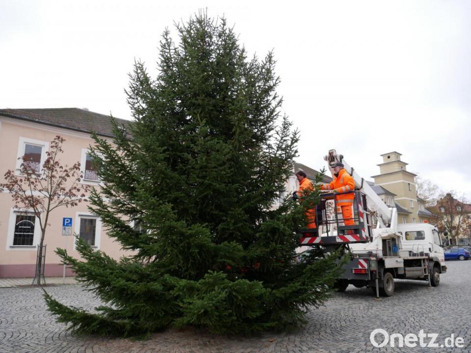 In der Advents- und Weihnachtszeit werden in Waldsassen insgesamt drei Christbäume wieder für weihnachtliche Stimmung sorgen. Einen Baum mit elf Meter Höhe haben die städtischen Arbeiter auf dem Johannisplatz aufgestellt. Bereits am Dienstag war mit dem Anbringen der Lichterketten begonnen worden.