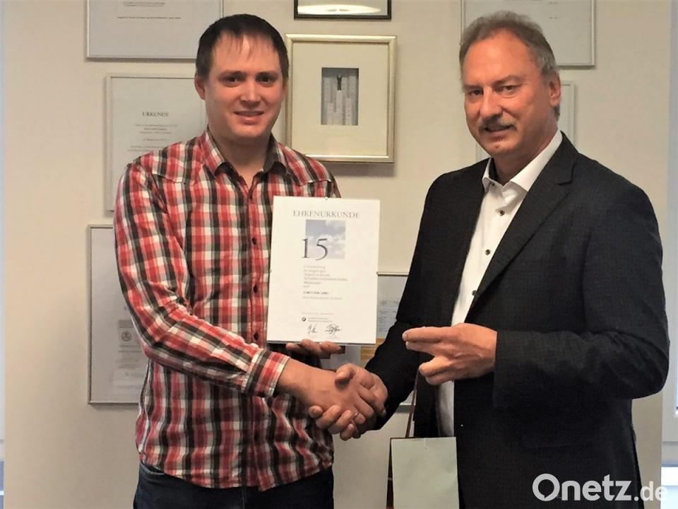 Bei dem Betrieb in Waldsassen begann Lang 2003 seine Ausbildung zum Heizungsbauer. Nun wurde der Mitarbeiter für 15 Jahre Firmenzugehörigkeit und für langjährigen engagierten Einsatz geehrt. Geschäftsführer Norbert Schmeller überreichte Christian Lang aus diesem Anlass die Urkunde der Handwerkskammer Bayern sowie eine Anerkennung für seine Treue. "Dieses Vorzeigemodell muss kein Einzelfall sein", betonte Norbert Schmeller. Jeder Auszubildende der Firma werde direkt in die laufenden Projekte mit einbezogen und erhalte regelmäßige Weiterbildungen. Von Azubi über Geselle und Meister bis hin zu einer leitenden Position, wie Christian Langs Meilensteine beweisen: "Die Möglichkeiten einer Lehre sind breit gefächert." Die Firma Schmeller stelle jedes Jahr mehrere neue Lehrlinge ein. Dieses kontinuierliche Wachstum sei auch nötig, so Norbert Schmeller - auch im Hinblick auf die vollen Auftragsbücher.