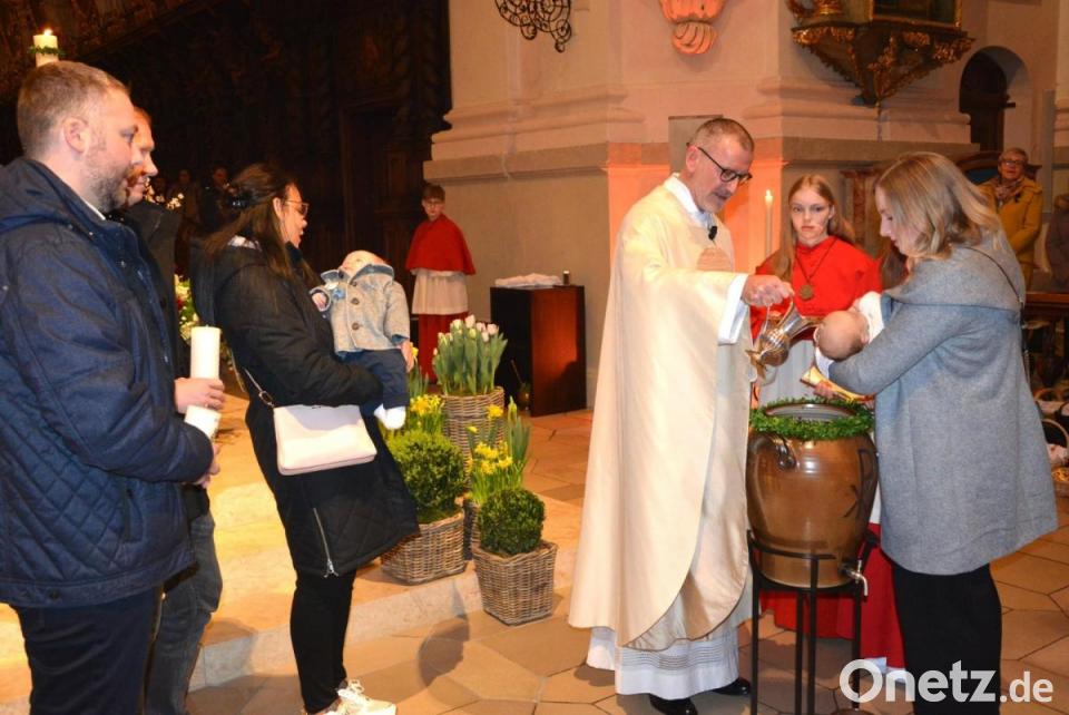 Die Taufe war ein besonderes Erlebnis für die Gläubigen am Samstagabend in der Basilika. Mit einem Festgottesdienst wurde die Auferstehung von Jesus Christus gefeiert. Eröffnet wurde die beeindruckende Osternacht mit der Segnung des Osterfeuers, das die Waldsassener Feuerwehrjugend auf dem Basilikaplatz aufgebaut hatte. 25 Jugendliche und Betreuer unter der Regie von Georg Mayer und Julius Wilholm sorgten für das Feuer und die Sicherheit rundum. Schon seit 25 Jahren ist die Jugendfeuerwehr für diese österliche Einstimmung zuständig. Die anschließende Osternachtfeier zelebrierte Stadtpfarrer Dr. Thomas Vogl, assistiert von Pfarrer Anton Witt, Ruhestandsgeistlicher in Waldsassen. Mit dem Gloria erstrahlte die Basilika und zeigte sich von ihrer schönsten Seite, nachdem das Gotteshaus zunächst nur mit Kerzenlicht beleuchtet war. „Der Tod hat keine Macht mehr“, betonte Pfarrer Vogl in seiner Predigt. Ein Höhepunkt der Osternacht war die Taufe von Elias Schnurrer und Max Thaler, die damit in die Gemeinschaft der Kirche aufgenommen wurden. „Wir wollen mit der Taufe den guten Plan Gottes für die beiden Kinder und deren Leben in die Tat umsetzen“, sagte der Stadtpfarrer. Musikalisch wurde der Gottesdienst vom Basilikachor umrahmt.