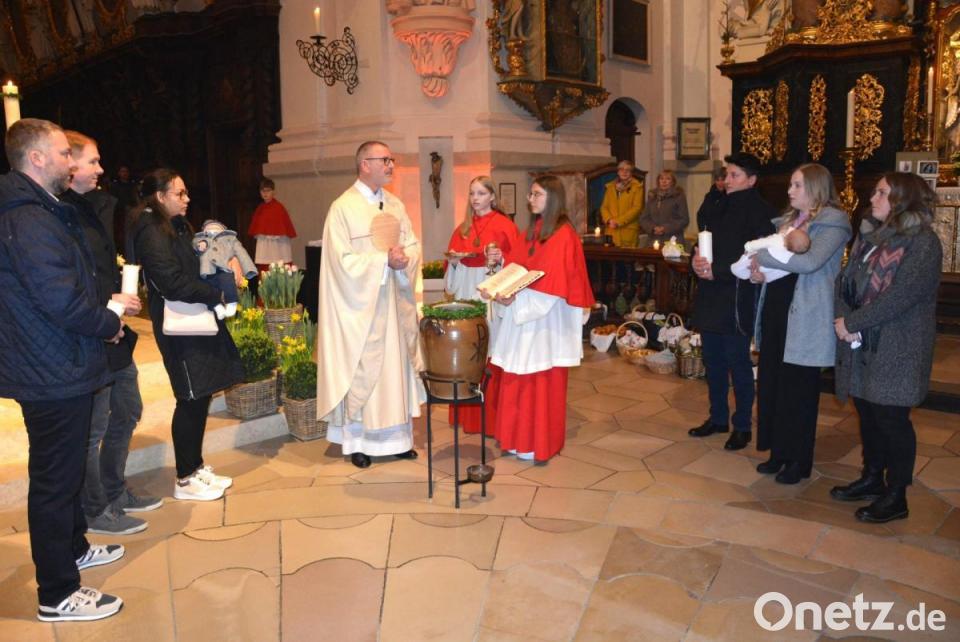 Stadtpfarrer Dr. Thomas Vogl (Mitte) spendete dem kleinen Max (links) und Elias am Samstag im Rahmen der Osternachtfeier in der Basilika das Sakrament der Taufe. Nicht nur für die Eltern der Kleinen ein sehr beeindruckendes Erlebnis. Die Kinder ließen die Taufe seelenruhig über sich ergehen.