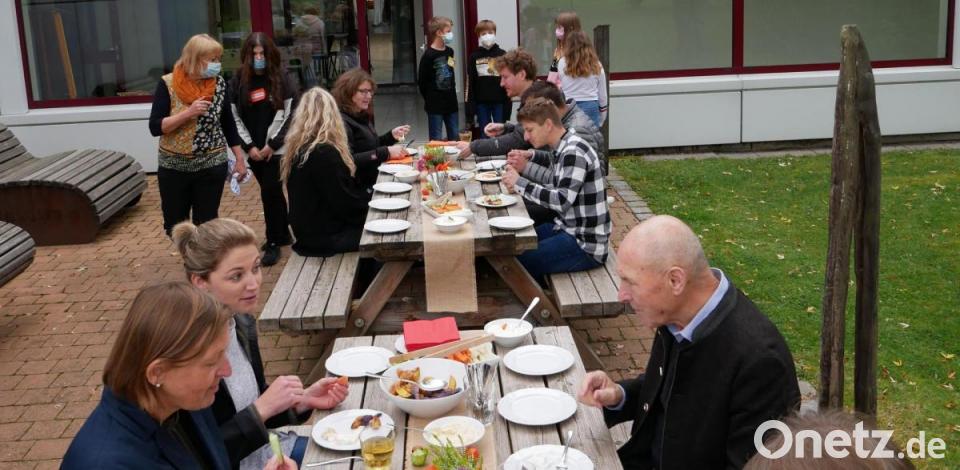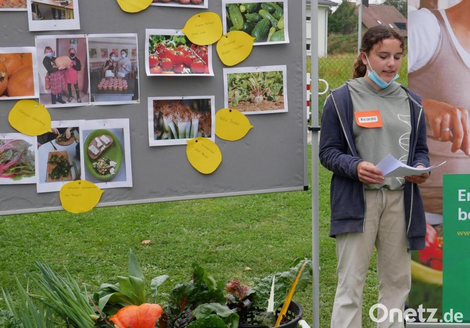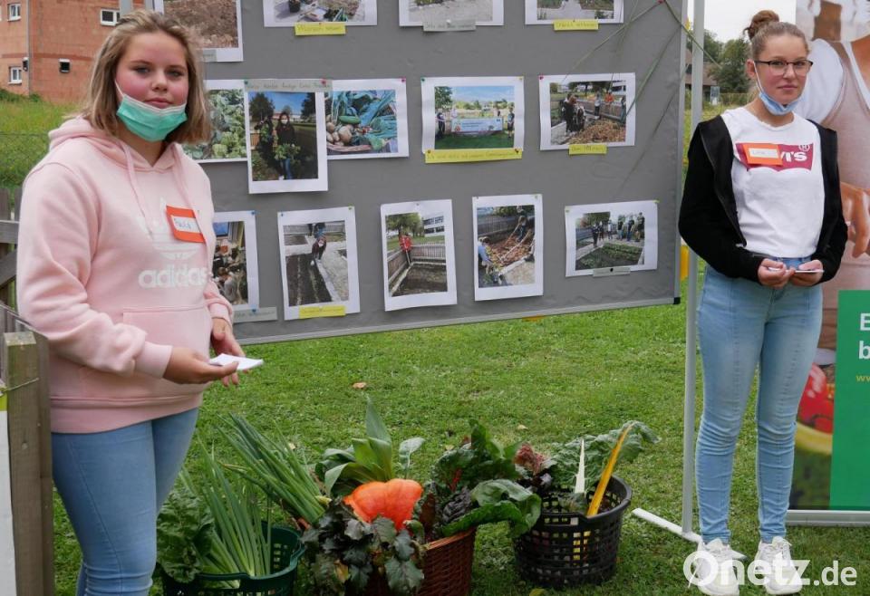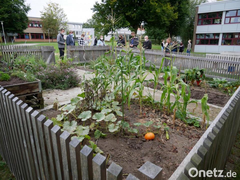 Vor dem Gemüseacker stellten Lisa Chotwacs, Samanta Husakova, Paula Zant und Lina Wenisch von den beiden Gartenteams der Klasse 8 M vor, was alles auf dem Schulacker gewachsen ist. Von Zwiebeln über Kürbis, Kartoffeln, Karotten, Sojabohnen, Rote Bete, Kohlrabi, Zuckermais, Radieschen, Schwarzwurzel, Chinakohl bis zu Gurken, Kresse, Mangold und Zuckererbsen reichte die Erfolgsliste. Nur bei den Tomaten gab es dieses Jahr aufgrund der Witterung kaum was zu ernten.