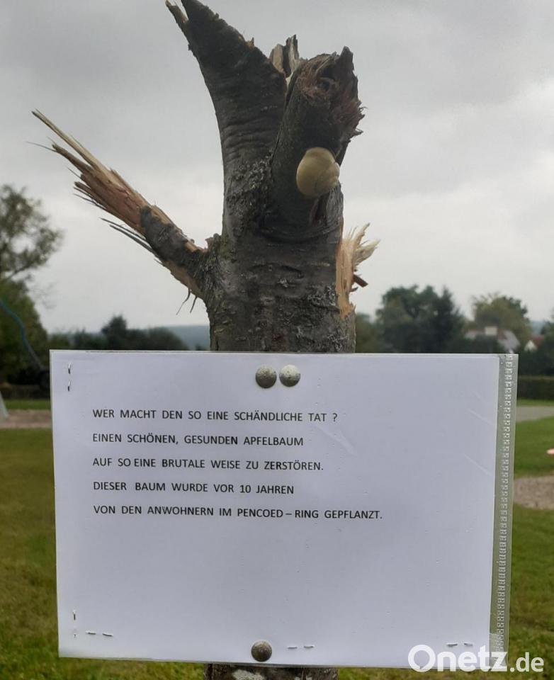 "Wer macht denn so eine schändliche Tat?", hieß es auf dem Schild, das am Stamm des beschädigten Apfelbaumes befestigt wurde. Über die Verursacher wurde nichts bekannt – auch nicht, nachdem Reinhard Rustler, einer der Anwohner, die mutwillige Beschädigung auf seiner Facebook-Seite öffentlich machte.