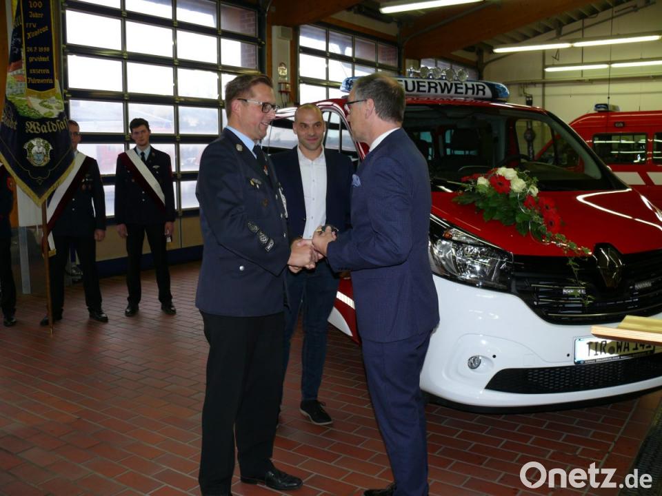 Alexander Grüner vom Autohaus Braunschläger übergab symbolisch den Fahrzeugschlüssel an Bürgermeister Sommer, der diesen gleich an Kommandant Tippmann weiterreichte. Kreisbrandrat Andreas Wührl gratulierte der Feuerwehr zur Neuanschaffung und sprach in Anbetracht der bis dato 144 geleisteten Einsätze von einer tollen Leistung. Der Kreisbrandrat wünschte der Wehr mit dem Auto stets unfallfreie Fahrt und gesundes Heimkommen. Harald Heerle, Vorsitzender des Feuerwehrvereins und der Patenwehr Nabburg, überraschte mit einer "Christopherus-Plakette" für das neue Fahrzeug.