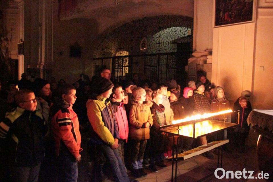 Die Teilnehmer bei den Opferkerzen, die den sonst dunklen Kirchenraum hell erleuchteten.