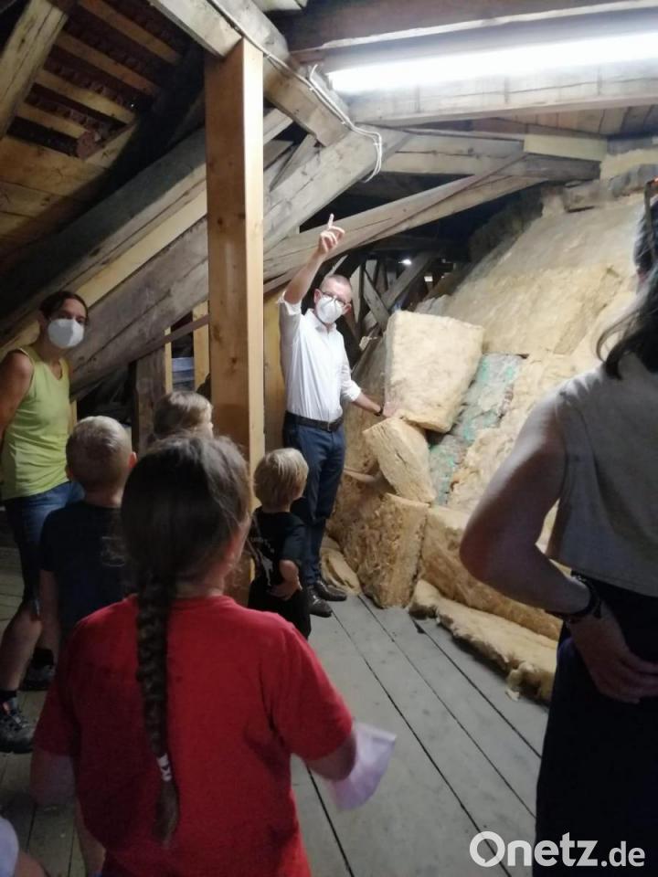 Dann warteten viele Treppen auf die Gruppe. Zuerst wurde der Dachboden inspiziert und manche Teilnehmer wunderten sich, wie aufgeräumt es dort ist. Bis zur großen Glocke ging es aber noch recht steil weiter, viele Stufen waren bis zum Ziel zu bewältigen. Die große Glocke, auch Dreifaltigkeitsglocke genannt, machte mächtig Eindruck auf alle. Einige Kinder verschwanden fast, als sie sich darunter stellten. Natürlich musste sie auch einmal angeschlagen werden und alle Teilnehmer erfuhren dadurch, wie laut sie klingen kann.