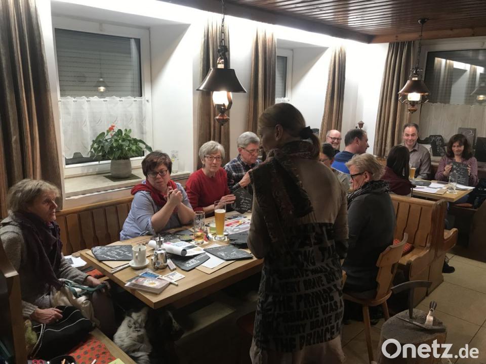 Nach einer kurzen Einleitung über das Material Schiefer zeigte Christine Böhm gekonnt den Anwesenden, wie man Schiefer in die gewünschten Größen und Formen brechen kann. Ebenso ging Frau Böhm auf die Formgestaltung mittels Hammer und Bohrer ein. Ausführlich erläuterte die Referentin, womit und wie man Schiefertafeln verzieren kann. Als Muster und Anschauungsmaterial stellte Christine Böhm ihre, teils aufwendig mit Glas, Schieferbruch und Malerei verzierten Exponate zur Verfügung. Ebenso hatten die Vorstandsmitglieder Vorlagen und zahlreiche Ausdrucke als Vorlagen mitgebracht, welche gerne angenommen wurden. In der Gaststätte der Vereinsmitglieder Ute und Johann Schmid waren die Frauen und Männer aus den Reihen der Waldsassener Gartenfreunde "voll bei der Sache", so heißt es in der Pressemitteilung. "Es entstanden sehenswerte Kunstwerke: Manche bestachen durch die Verzierungen, andere durch ihre Schlichtheit", so Schuster. Jeder Gast durfte seine Werke mit nach Hause nehmen. Als Dankeschön überreichte der Vorsitzende Schuster einen Fünf-Liter-Pack selbstgepressten Apfelsaft und die vorher gewünschte Flasche Rotwein.