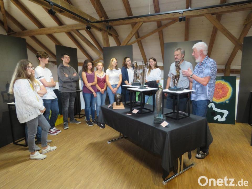 Die Künstler Hans-Georg Schulze und Toni Eichinger können sich freuen. Ihre Kunsthaus-Ausstellung wird nicht nur von Erwachsenen gerne besucht. Auch zwei Schulklassen kamen mit ihren Lehrkräften vorbei. Während die Q11 des Stiftland-Gymnasiums mit einem Bus anreiste, konnten die Achtklässler der Mädchenrealschule mit Kunstlehrerin Martina Mark den kurzen Weg vom Schulgebäude zum Kunsthaus zu Fuß bewältigen.