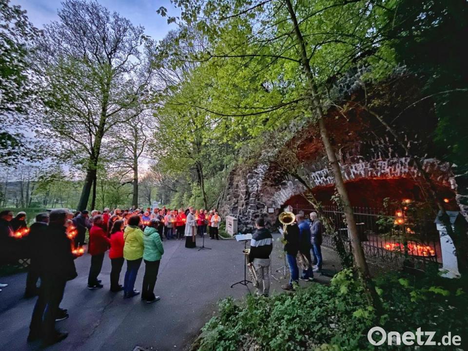 60 Kerzen, wie sie in der Basilika zur Liturgie in der Osternacht verwendet wurden, hatten die Verantwortlichen zur Lourdes-Grotte mitgebracht. Dass dann aber deutlich mehr Besucherinnen und Besucher kamen, sprach Stadtpfarrer Dr. Thomas Vogl auch der musikalischen Gestaltung zu.