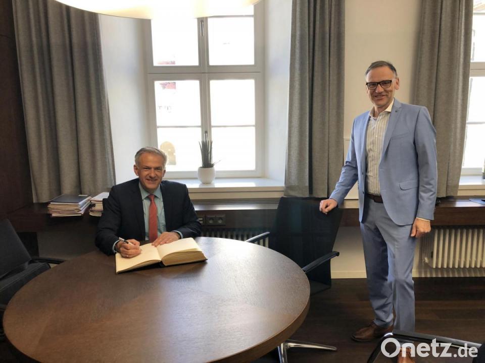 Ein Eintrag ins Goldene Buch der Stadt Waldsassen rundete den Gesprächstermin im Rathaus ab: Es war der erste Termin, den Roland Grillmeier (im Bild zusammen mit Bürgermeister Bernd Sommer in dessen Büro) als neuer Landrat des Landkreises Tirschenreuth in Waldsassen absolvierte.