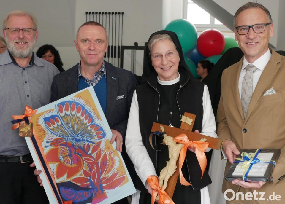 Als Einstandsgeschenk überreichte die Klosterchefin ein Bild mit dem Titel "Paradiesfalter" von Jörgen Habedank - eine Metapher die zeigt, wie die unscheinbare Raupe zum wunderschönen Schmetterling wird. Eine wunderbare Verwandlung, die hervorragend das beschreibe was aus dem ehemaligen Brauhaus aus der Barockzeit entstanden ist. Zudem überreichte sie ein Kreuz aus dem Klosterfundus, als Symbol der Verbundenheit zwischen Kloster und "Brauhaus-Physiopraxis".