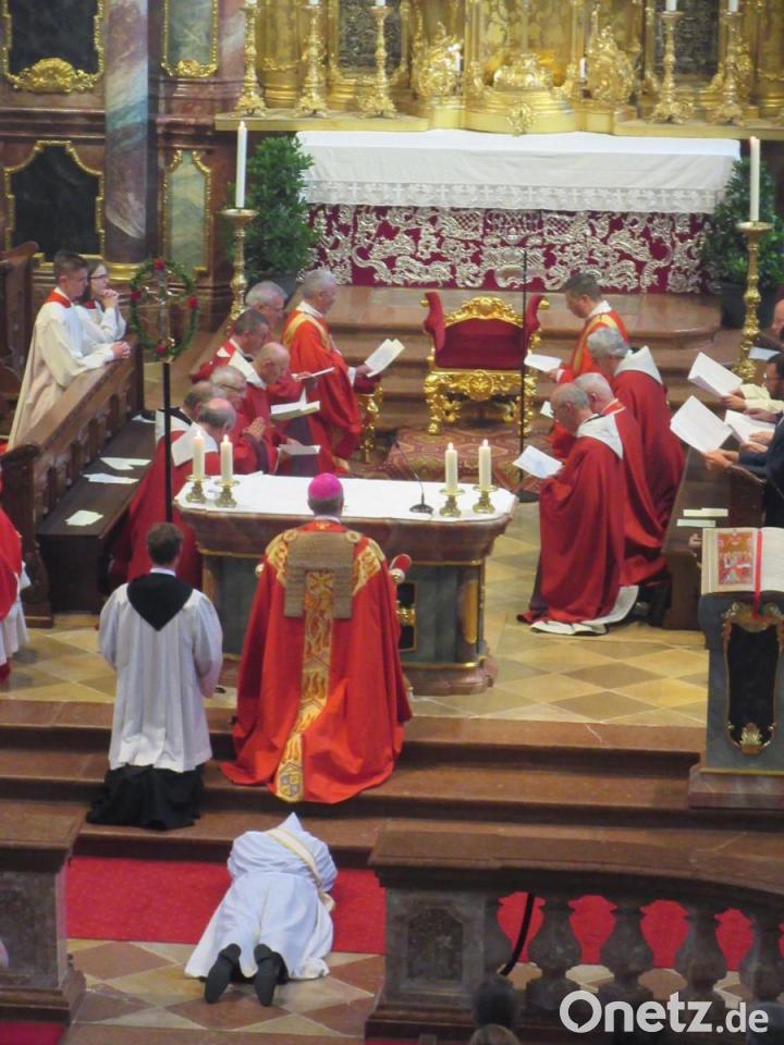 Durch die Handauflegung des Bischofs und aller Priester und durch das Weihegebet des Bischofs empfing Fr. Gregor das Sakrament der Priesterweihe. In den ausdeutenden Riten wurde ihm das Messgewand angelegt, seine Hände mit Chrisam gesalbt und schließlich Kelch und Hostienschale für seinen künftigen Dienst der Eucharistiefeier überreicht. Der Friedensgruß des Bischofs an den Neugeweihten beschloss die eigentliche Weihehandlung.
