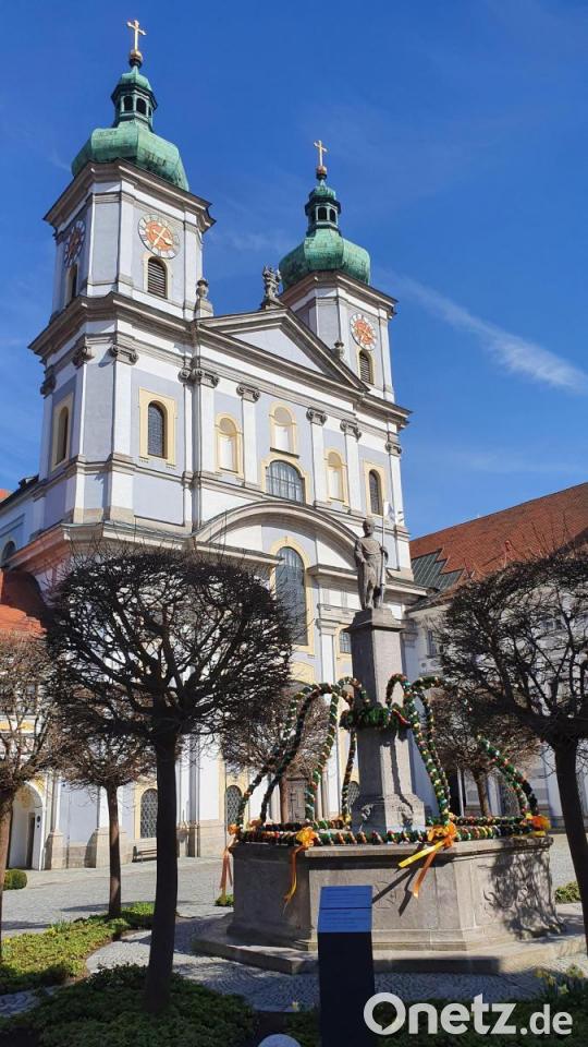 In vielen Orten im Landkreis Tirschenreuth sind inzwischen Osterbrunnen aufgebaut und weisen als besonderer Blickfang aufs bevorstehende Fest hin. In Waldsassen ist der österlich geschmückte Diepold-Brunnen am Johannisplatz mit der Stiftsbasilika im Hintergrund ein attraktives Fotomotiv.