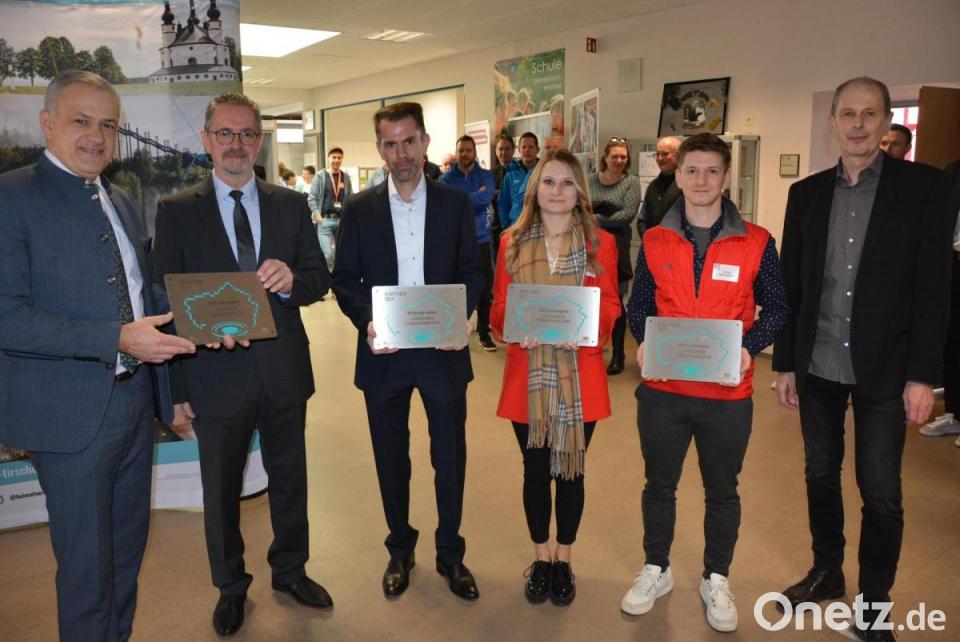 Die ersten Schilder als Partner der Bildungsregion Landkreis Tirschenreuth wurden an drei Firmen und die Realschule im Stiftland verliehen. Im Bild (von links) Landrat Roland Grillmeier, Realschulrektor Stephan Drexler, Carsten Heine (Schott AG), Laura Kittner (Firma Schmelzer), Jonas Baumgärtner (Firma Kassecker) und Bildungsmanager Hilmar Fütterer.