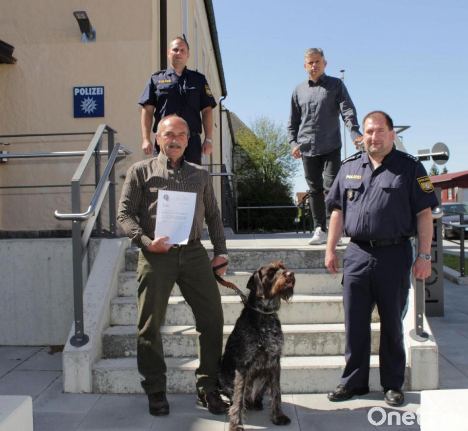 Der Leiter der Polizeiinspektion Waldsassen, Erster Polizeihauptkommissar Roland Heldwein, hatte nun die ehrenvolle Aufgabe, "Finn" und sein Herrchen auszuzeichnen. Er bedankte sich für das vorbildliche und couragierte Verhalten bei Häuslmann und seinem Hund. Als Anerkennung händigte er ein Dankschreiben von Polizeipräsident Norbert Zink und einen Geldbetrag als Belohnung aus.