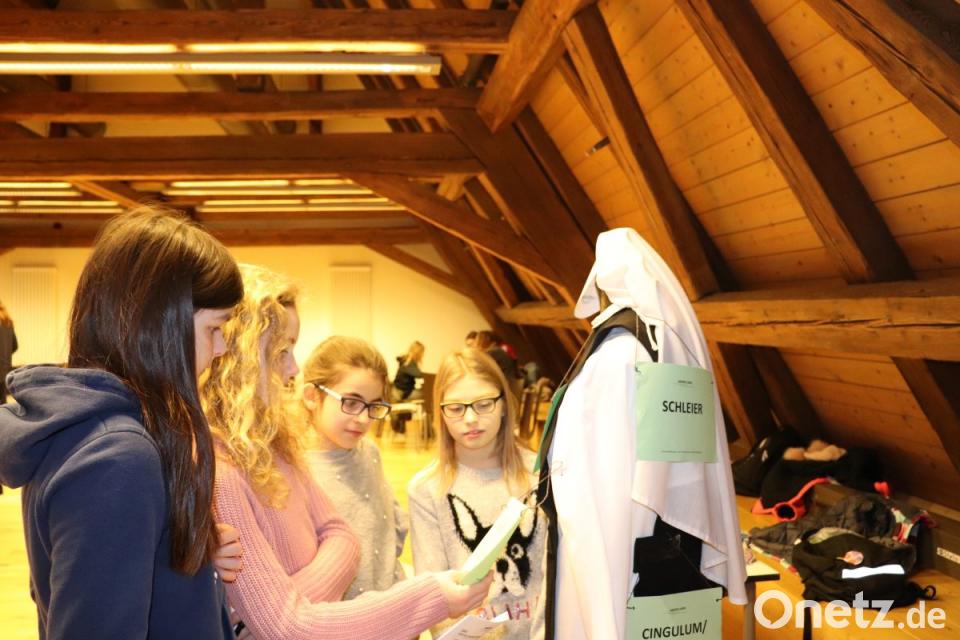 Mit einem gut schmeckenden und gesunden Klassenfrühstück, das die Mädchen selbst zusammen vorbereitet hatten, startete man in den Tag. Dann ging es im Maurus-Saal des Gästehauses St. Joseph zu fünf Stationen rund um das Klosterleben. "Anders! Aussehen", "Anders! Benediktinisch", "Anders! Ort" und "Anders! Zeit" waren die Schlagworte: Anhand von Texten, Bildern, Schautafeln und einer Schaufensterpuppe im Ordenshabit arbeiteten sich die Schülerinnen unterstützt von den beiden Schwestern in die Themen Ordenskleidung, Ordensgeschichte allgemein, Hausgeschichte des Klosters Waldsassen, Räume und Tagesablauf in einem Kloster ein. Mit Feuereifer und Interesse waren sie bei der Sache.