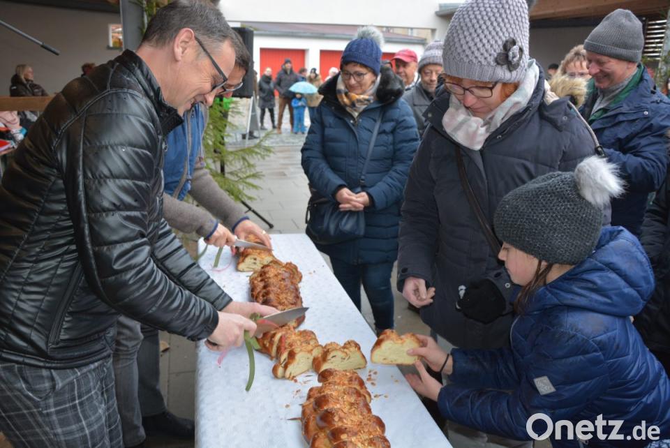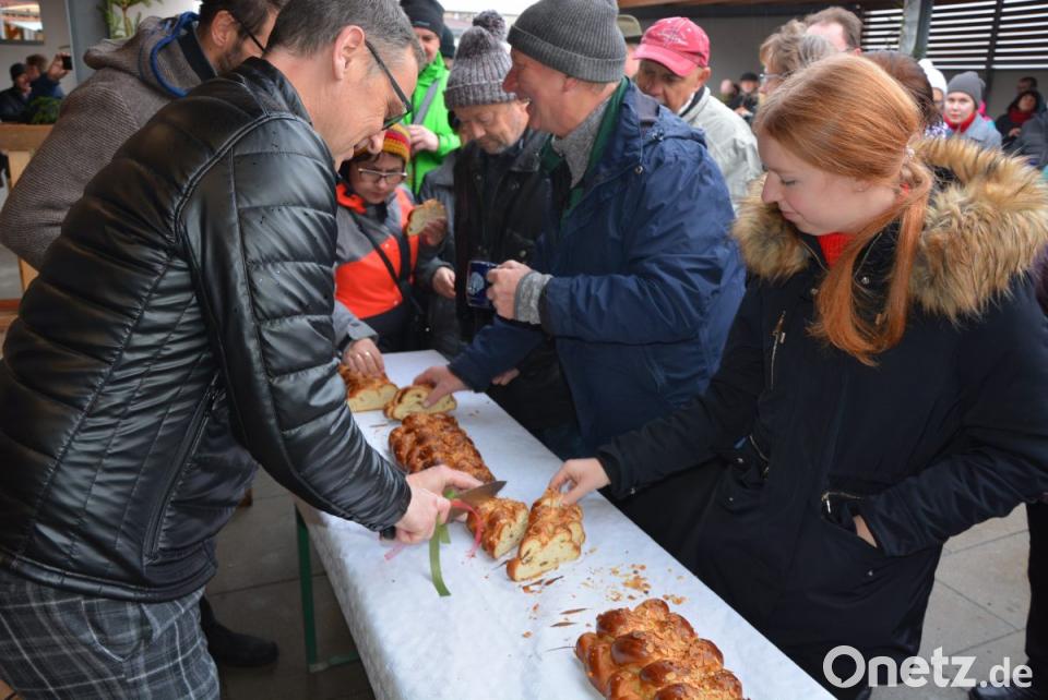 Bernd Sommer hatte genau nachgemessen und festgestellt, dass der Stollen der tschechischen Freunde 1,60 Meter lang war. Der Bürgermeister freute sich, dass trotz Schmuddelwetters am Sonntagnachmittag doch etliche Besucher gekommen waren, um diesen Leckerbissen zu genießen. Sommer hieß seinen Amtskollegen Patrick Pizinger willkommen: „Wir sind Freunde geworden.“