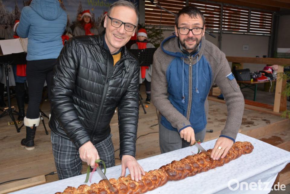 Die Waldsassener hatten heuer kein Glück mit dem Wetter. Auch am zweiten Wochenende des Weihnachtsmarktes regnete es. Davon ließen sich die beiden Bürgermeister Bernd Sommer (Waldsassen) und Patrick Pizinger (Chodov) aber nicht die Laune verderben, als sie gemeinsam einen Stollen aus Chodov anschnitten und ihn unters Volk brachten. Die kostenlosen Proben fanden reißenden Absatz.