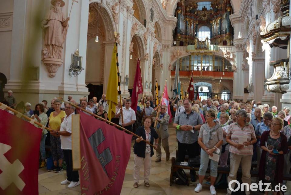 Nach der Ankunft in Waldsassen zogen die Senioren von der Mittelschule aus zur Basilika, wobei sie von knapp 20 Fahnenträgern angeführt wurden. Gudrun Sirtl, Vorsitzende des KAB-Ortsverbands Waldsassen, begleitete die Pilger auf ihrem Weg durch die Stadt. Kirchenpfleger Martin Rosner hieß die Gäste aus Franken in der Basilika willkommen und stellte ihnen die Kirche vor. "Sie sehen heute das Gotteshaus in der Originalfassung von 1704", sagte Rosner mit Verweis auf die mehrjährige Sanierung des Gotteshauses.
