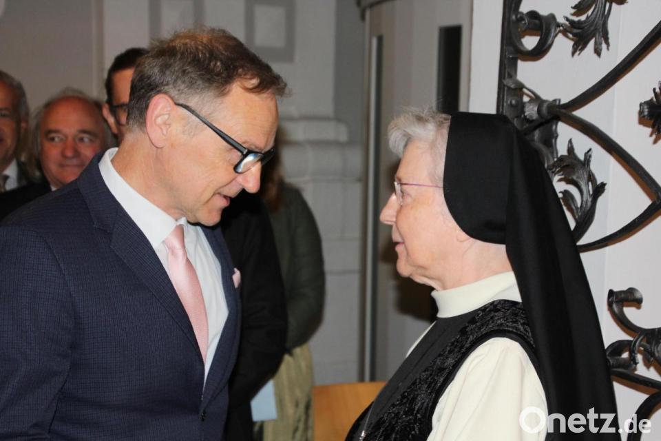 „Bete, arbeite und lies“, dies seien die Regeln des heiligen Benedikt. Das neumoderne Wort „Work-Life-Balance“ werde hier schon seit Jahrhunderten umgesetzt. Seit 160 Jahren würden hier junge Frauen im Geiste Gottes gestärkt und ihnen ein Fundament fürs Leben mitgegeben. Was gebe es Besseres, als mit jungen Menschen den Puls der Zeit zu fühlen und daraus einen Lebensinhalt zu erwecken, der Hoffnung für die Zukunft gebe. Dafür stehe das Kloster, dafür stehe die Schule, dafür stehe Äbtissin „Mutter Laetitia“, die ganz nach ihrem Motto „Auf den Herrn vertrauen, neue Kraft schöpfen“, setze.