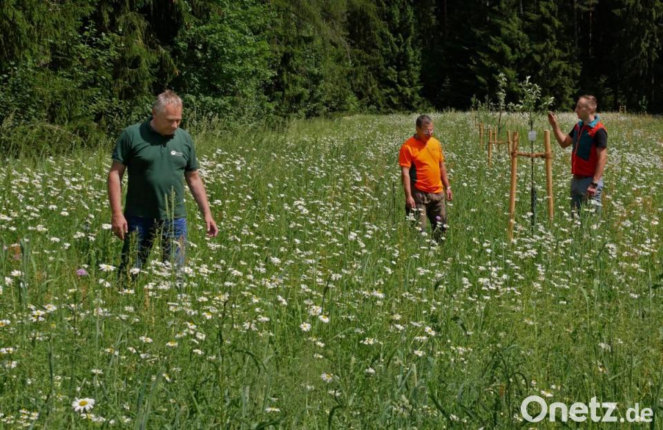 Drei Förster des Forstbetriebs (FB) Waldsassen sind in der Abteilung "Rehbuckl" unterwegs auf einer eher außergewöhnlichen Mission. Der Chef, Norbert Zintl, sein Stellvertreter Florian Fischer und Revierleiter Dietmar Michalski schauen sich an, wie sich die angelegten Blühwiesen im Revier Hatzenreuth entwickelt haben. Sie sind mit dem Ergebnis zufrieden.