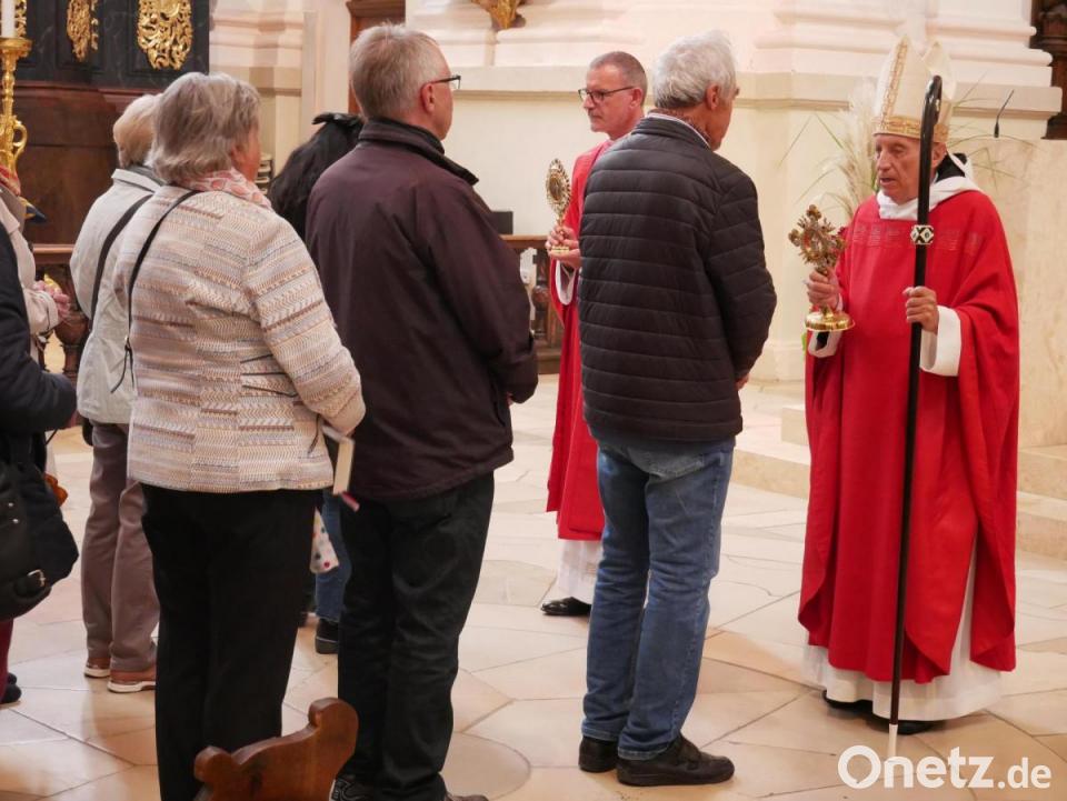 Nach dem Gottesdienst ließen sich Gläubige vom Abtpräses em. und Stadtpfarrer Vogl mit dem Kreuzreliquiar und der Zusage „Im Kreuz ist Heil, im Kreuz ist Leben, im Kreuz ist Hoffnung“ einzeln segnen.