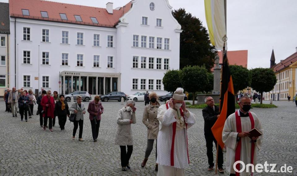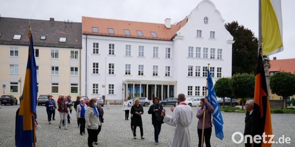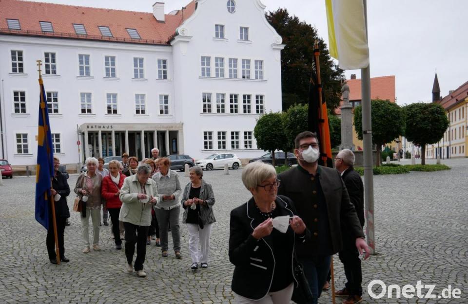 Aus drei Richtungen zogen vor dem Gottesdienst die Gläubigen zur Basilika. Die Kolpingsfamilie kam vom Flurkreuz in der Neualbenreuther Straße, die KAB von der Rosenkranzstation in der Chodauer Straße und der Katholische Deutsche Frauenbund mit der Vita-Gruppe vom Seniorenheim St. Martin in der Eichendorffstraße. Gemeinsam mit dem liturgischen Dienst zogen die drei Vereinsfahnen in die gemäß den Hygieneregeln gut besetzte Basilika ein.