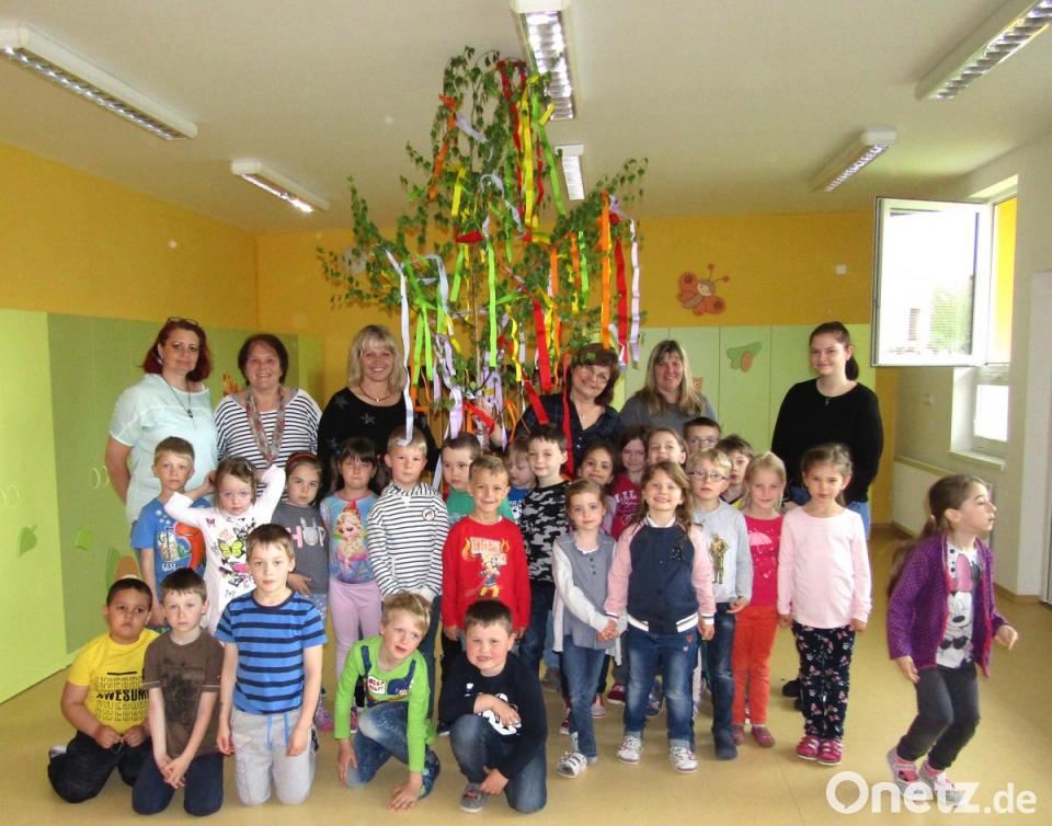 Mit dem Begrüßungslied Dobrỳ den ("Guten Tag") begann der Projekttag. Wegen des schlechten Wetters konnten die tschechischen und deutschen Kinder den Maibaum nicht draußen schmücken so wurde der Frühlingsbote im Gruppenraum mit vielen bunten Bändern behängt. Jedes Kind durfte sich ein Band aussuchen und dieses am Baum befestigen.