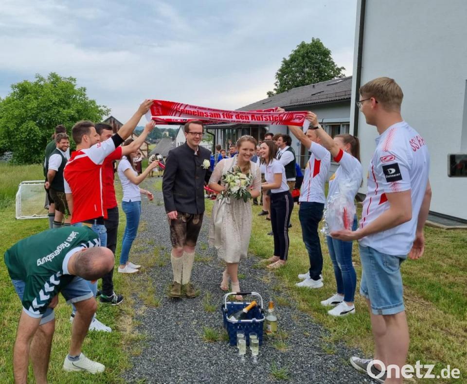 Die Braut ist aus Waldthurn und arbeitet als Chemikerin bei Lüberg in Weiden. Ihr Mann stammt vom Lennesriether Haselranken, ist stellvertretender Dorfsprecher und als Personalcontroller bei einem Unternehmen in Poing bei München tätig. Freunde aus Anzing waren angereist, um dem Paar zu gratulieren und brachten exklusiv ein Wappen für das Rathaus und den Bürgermeister mit. Auch die Jahnfreunde Vohenstrauß, bei denen das Paar bei den Spielen des SSV Jahn Regensburg mitfiebert, waren so wie die Fußballerinnen und Fußballer des SV Altenstadt bei Vohenstrauß gekommen, um die Glückwünsche zu überbringen.