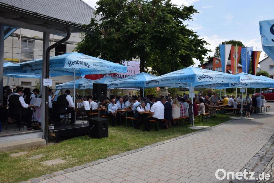 Vor dem Waldthurner Rathaus ging es am Donnerstag hoch her. Mehr als 20 Musikanten starteten unter der Leitung von Josef Pflaum senior mit bairisch-böhmischer Musik in den Tag. Die zum musikalischen Frühschoppen angebotenen Weißwürste und Brezen gingen weg „wie die warmen Semmeln“. Bei vielen blieb zu Hause die Küche kalt und man ließ sich Schweinebraten und Schnitzel im Schatten des Schlosses schmecken.