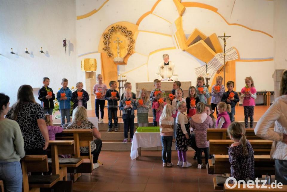 "Für die Vorschulkinder sind dies die letzten Tage im Kindergarten – nun gehen sie ein Häusl weiter in die Schule", meinte Götz. Man wolle für das Kindergartenjahr heute vor Gott danken. Zum Abschied bekamen die Vorschulkinder ein gesegnetes Kreuz umgehängt und durften einen kleinen Baum, eine Eiche, mit nach Hause nehmen. "Ihr sollt wie ein Baum wachsen und Menschen werden, an denen Gott und andere Menschen ihre Freude haben", sagte Götz. Die Liebe zu Gott und zu Jesus Christus solle wie der kleine Baum wachsen. "Jeder Baum braucht Wurzeln – wir brauchen die Verbindung zu Gott." Schließlich hallte fröhlicher Gesang, teilweise als Sologesang junger Sängerinnen, durch das Kirchenschiff. Kita-Leiterin Sonja Kick spielte dazu Gitarre, Martina Lorenz das Schifferklavier und Elisabeth Beimler die Blockflöte. Schließlich verabschiedete die nächstjährigen Vorschulkinder ihre Vorgänger mit einem Lied.