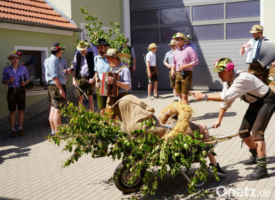 Lennesrieth. Obwohl man den Langschläfer doch erheblich nass machte, hatte er es bei herrlichem Sonnenschein und warmen Temperaturen relativ einfach. Vormittag waren die teilweise über 20 Pfingstschwanzfahrer noch brav bei der Flurprozession von Lennesrieth über Woppenrieth nach Waldthurn dabei. Danach marschierten sie aber sofort zum "Pfingstschwanz-Warmlaufen" ins Lennesriether Dorfwirtshaus "Zur Grünen Linde".