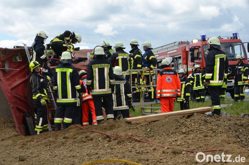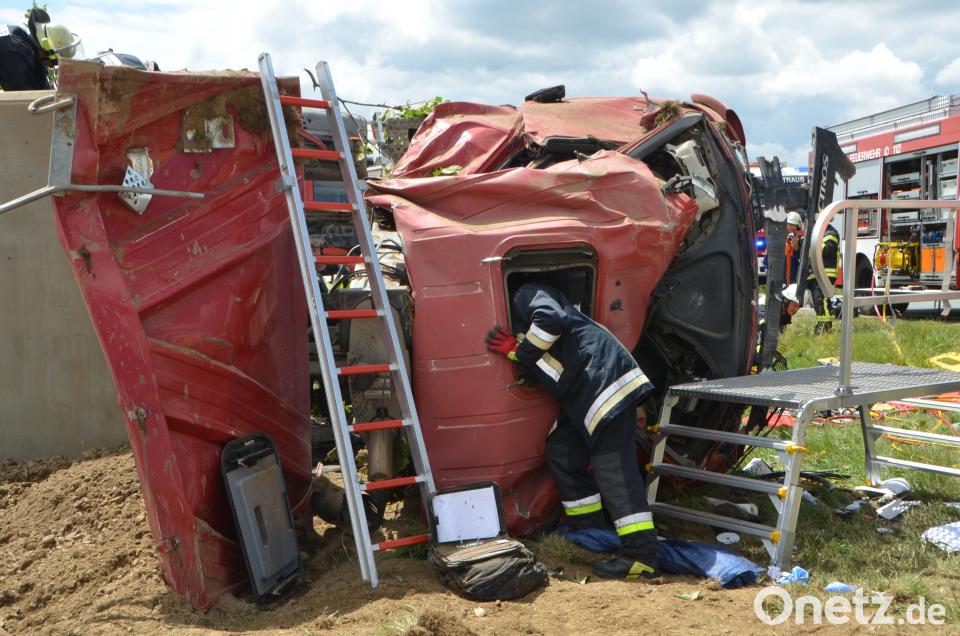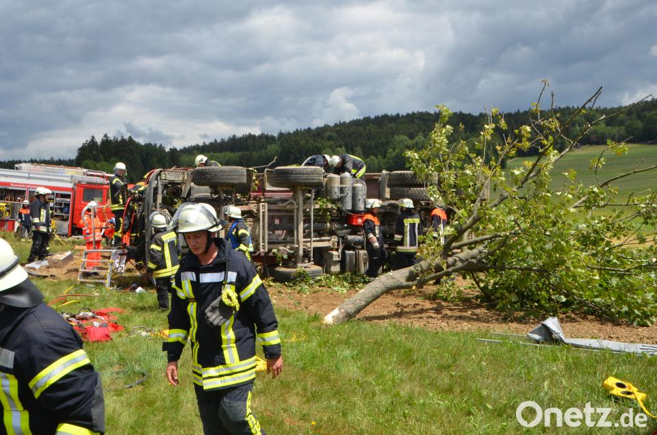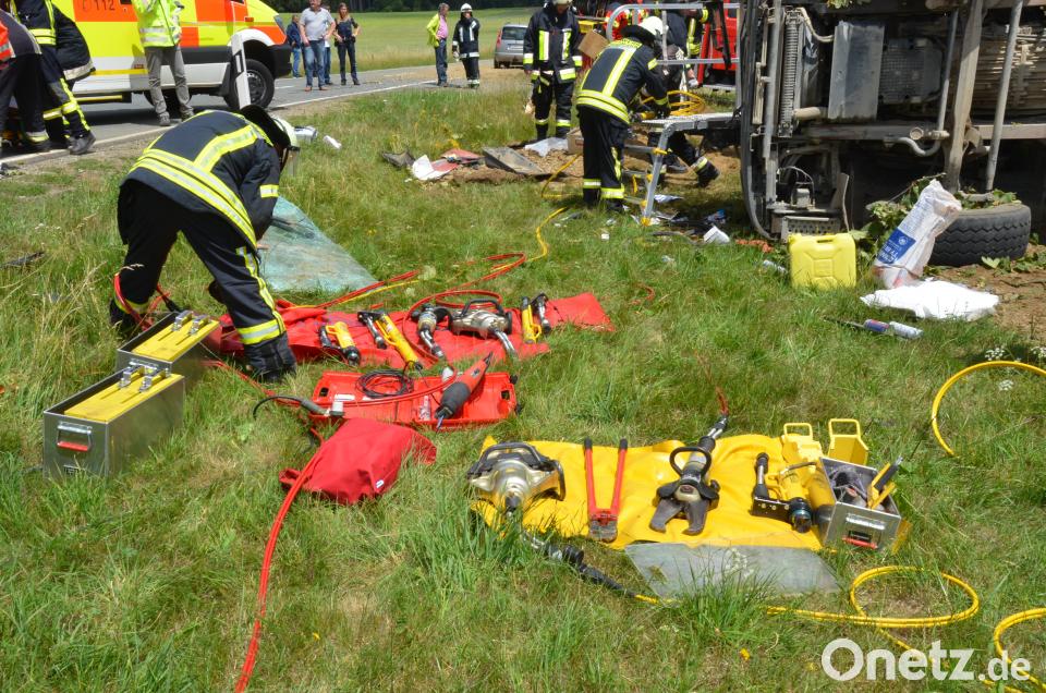 Kreisbrandrat Marco Saller und Kreisbrandinspektor Martin Weig koordinierten den Einsatz. Durch die Dachluke konnte der Fahrer schließlich befreit werden. Notarzt Dr. Gunther Weig und die BRK-Rettungskräfte des Rettungswagenstandorts aus Lohma und der Hauptwache in Weiden mit dem Organisatorischen Leiter Rettungsdienst Bertram Kincl leisteten Erste Hilfe. A