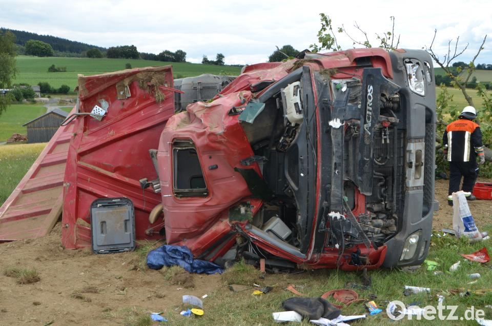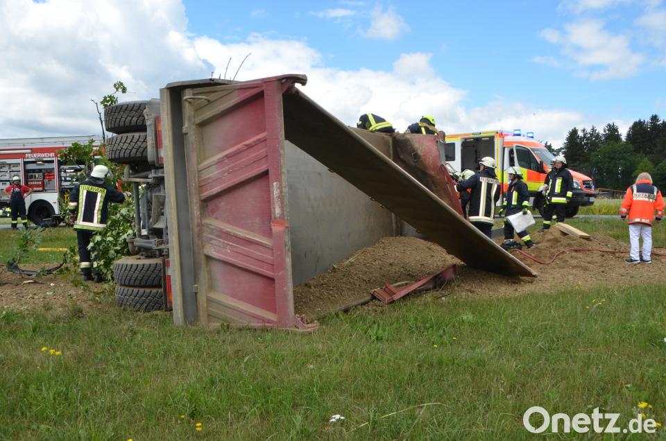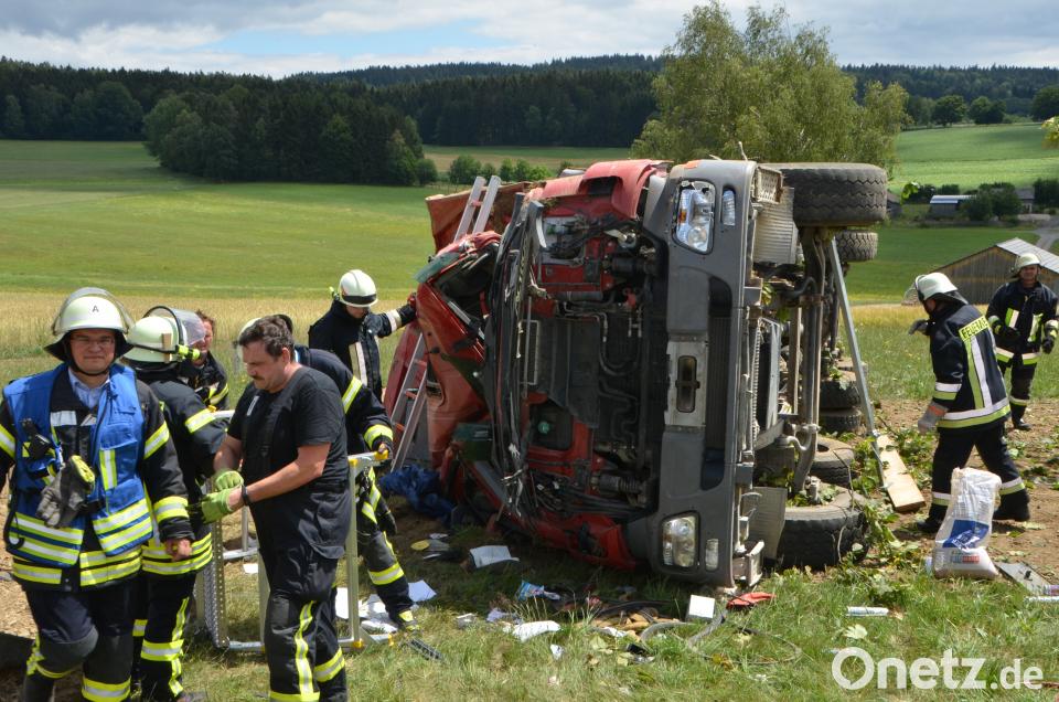 Anschließend schob sich das tonnenschwere Fahrzeug über die Fahrbahn und kippte links in der angrenzenden abschüssigen Wiese um. Dort blieb der Lkw total demoliert auf der rechten Fahrzeugseite liegen. Der Berufskraftfahrer wurde in der Führerkabine eingeklemmt. Feuerwehrkräfte aus Waldthurn, Vohenstrauß und Pleystein brauchten mehrere Rettungssätze, um an den mittelschwer verletzten Fahrer zu gelangen. In Windeseile bauten die Feuerwehrleute eine Rettungsplattform vor dem Führerhaus auf, um professionelle Hilfe leisten zu können.