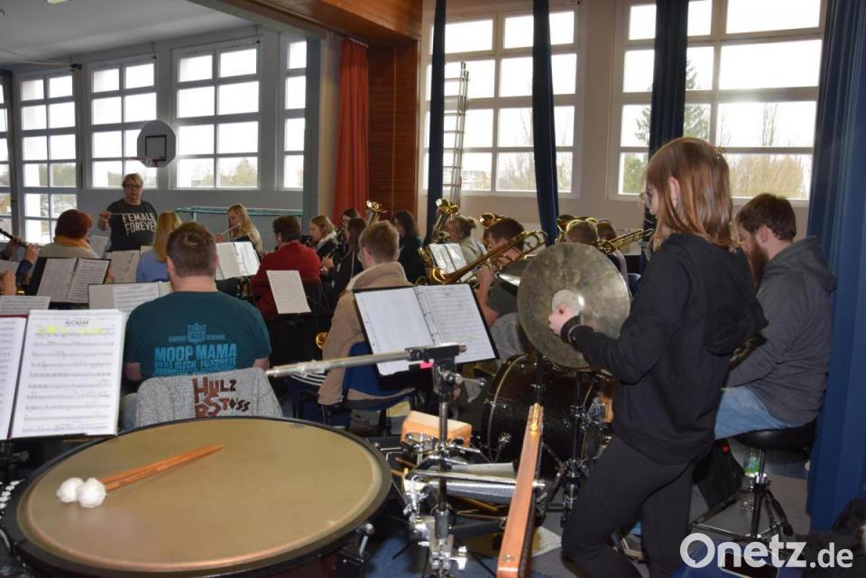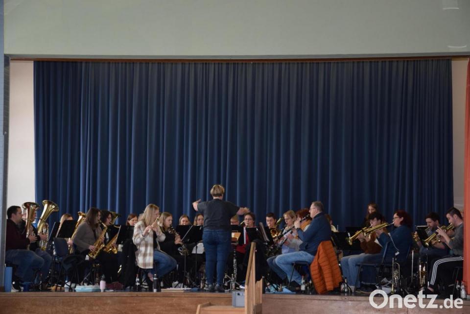 Seit Anfang des Jahres studieren die rund 30 Musikanten unter der Leitung von Cornelia Kraus die zahlreichen neuen Musikstücke ein. Es finden mittlerweile neben den üblichen Treffen am Freitagabend zusätzlich ganze Probentage, meist am Wochenende, auf der Bühne der Schulturnhalle statt. Der Platz auf der Bühne reicht gerade so – neben den Plätzen für die Musikanten müssen ja auch Schlagzeug, Pauken und verschiedene Percussions-Instrumente aufgebaut werden.