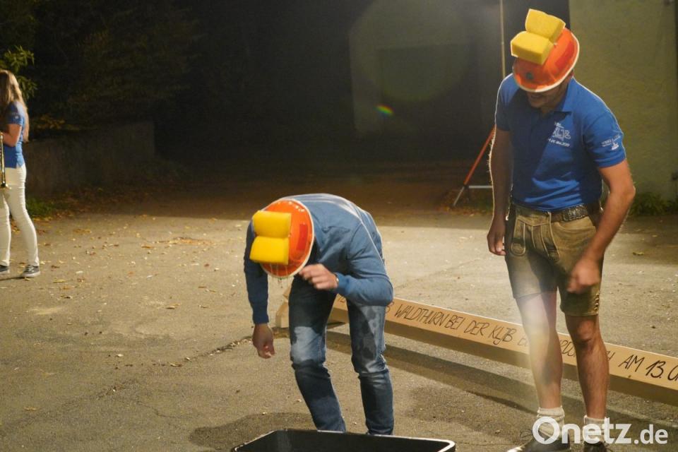 Die Gäste lernten, was "Einfach kann jeder - wir nicht" bedeuten sollte: So hatte das vermeintliche Patenkind die Aufgabe, mit Helm auf dem ein Schwamm befestigt war, Wasser von Wanne zu Wanne über einen Hindernisparcours zu bringen. Johannes Menner und Lukas Ertl bewältigten diese Aufgabe zwar mit einem kleinen Trick, aber souverän. Zur gleichen Zeit mussten die KLJB-Vorsitzenden Hannah-Sophia Hornstein, Julian Steiner sowie der Festausschuss mit Franziska Wittmann und Felix Griesbach aus einem Eimer mit Kälbersauger ein "Patenbittenfestgetränk" trinken. Der Waldthurner Festausschuss musste sich gegenseitig mit verbundenen Augen verschiedene Leckereien wie Schaumküsse zukommen lassen. Nachdem die Waldthurner dies alles bewältigt hatten gingen die vermeintlichen Patenkinder auf Weisung wieder auf ihren Jammerbalken in Stellung.